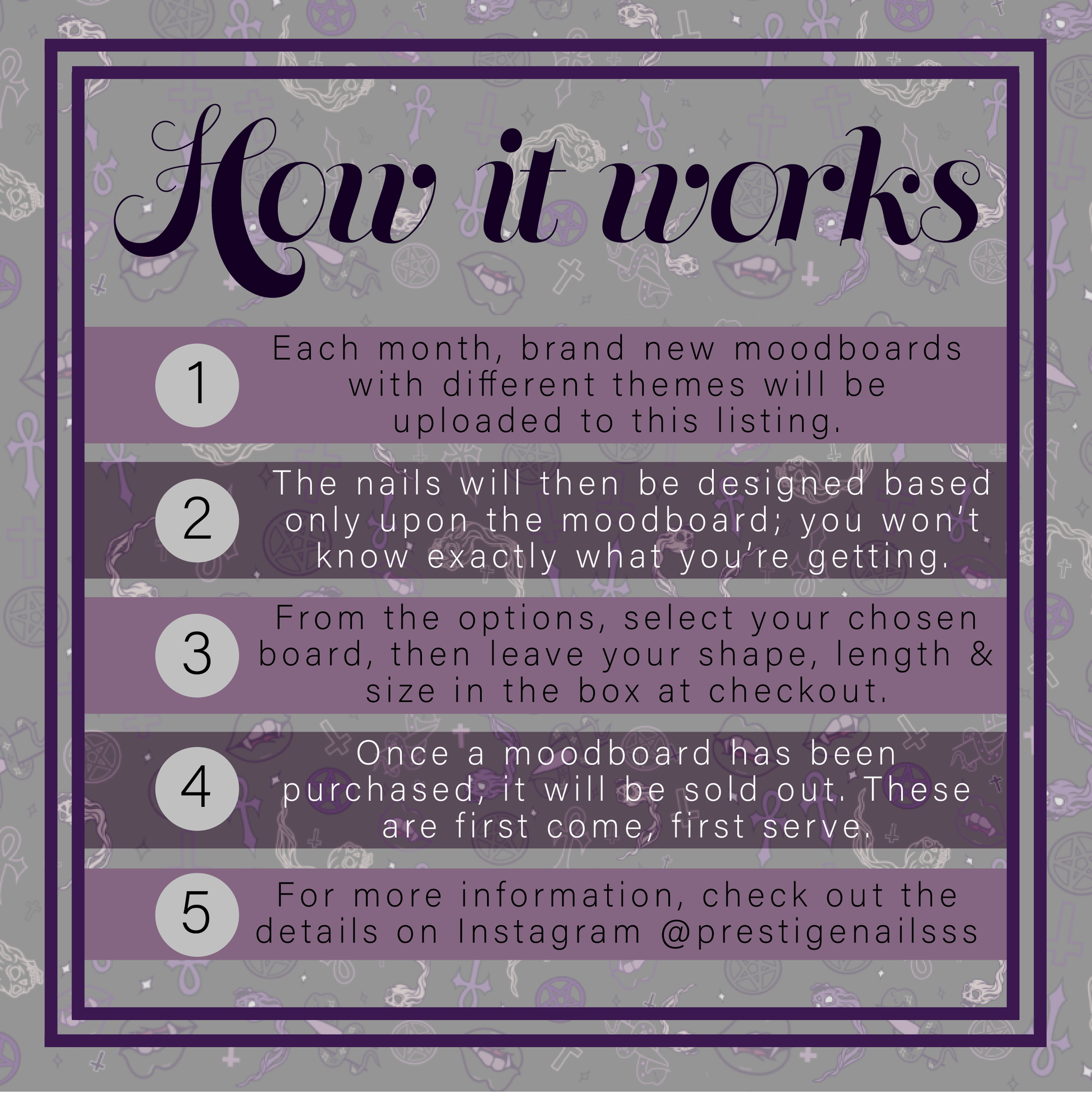Custom-made to your preferences with salon quality materials. Choose from the available moodboards & receive a set of mystery nails based upon the theme.