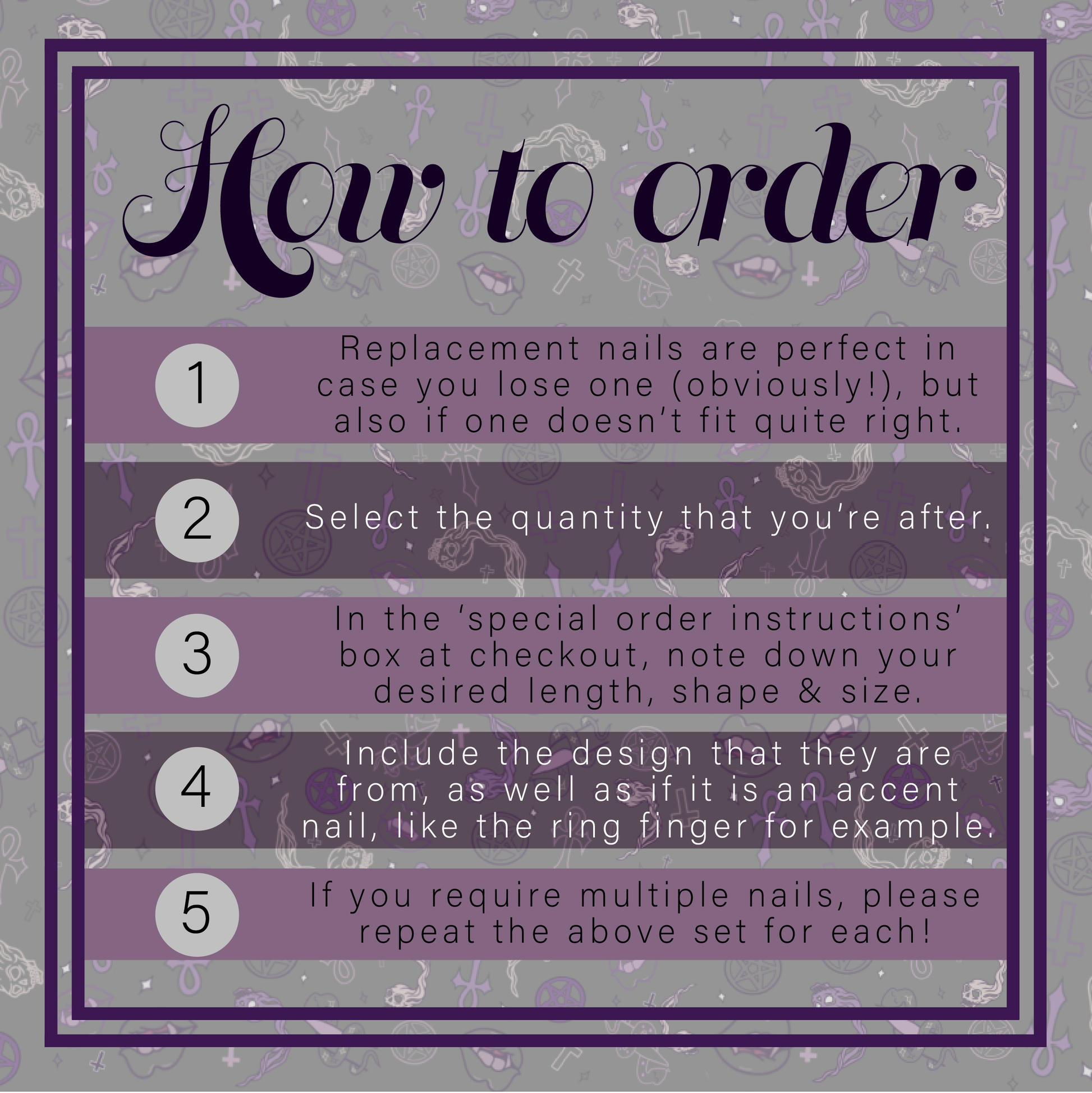 In the 'order special instructions' box, note down your desired shape, length and size. Also include which set they are for so the design is consistent, and if one is a specific design like a 'ring finger accent'.